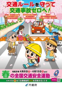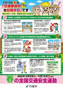 さて、今年は4月6日(月)から15日(水)の日程で、春の全国交通安全運動が実施されます。また、4月10日(金)は交通事故死ゼロを目指す日となっております。